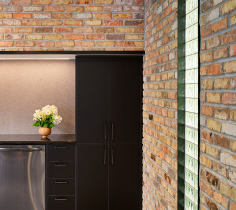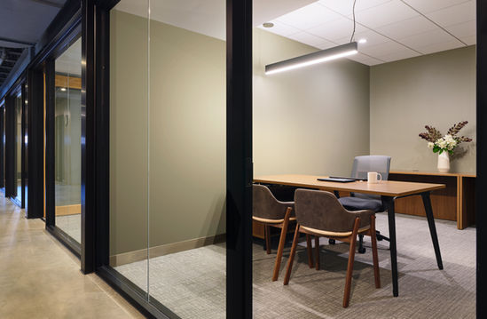 For their first office, 4 Corners wanted a space that represented their work - construction and real estate development. Kuchar took inspiration from this direction, using common building materials to create the design landscape. Exposed brick, concrete and glass block were all used as design elements. To add warmth, we selected furniture with wood tones and leather upholstery for a clean and masculine vibe.